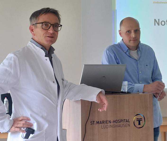 Mit großem Interesse und reger Beteiligung fand die interprofessionelle AINR-Fortbildung „Das akute Abdomen“ unter der Leitung von Chefarzt Dr. Mario Santamaria mit den Referenten Immanuel von Bar und Dr. Johannes Ruhe aus dem St. Marien-Hospital statt. Mehr als 30 medizinische Fachpersonen aus unterschiedlichen Bereichen aus dem Kreis Coesfeld – darunter Ärztinnen und Ärzte, Pflegekräfte derAnästhesie, der Intensivstationund der Notaufnahme sowie Kolleginnen und Kollegen des Rettungsdienstes – nahmen an der ersten AINR-Veranstaltung des Jahres in der vergangenen Woche teil. Die hohe Teilnehmerzahl unterstrich erneut die Relevanz nach fachübergreifendem Austausch.